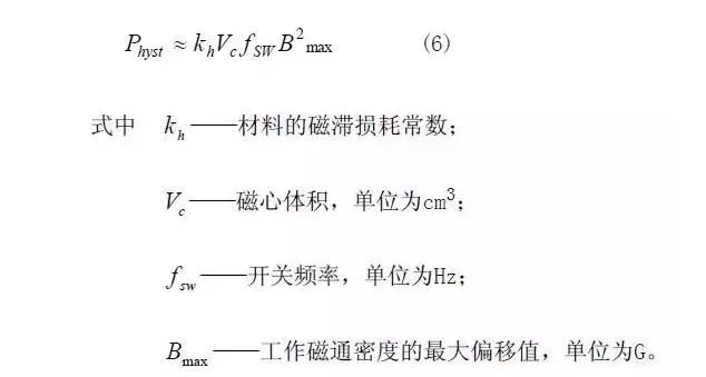 磁滯損耗與繞組的匝數和驅動方法有關。它決定了每個作業周期在B-H曲線內掃過的面積。掃過的面積就是磁場力所作的功,磁場力使磁心內的磁疇重新排列,掃過的面積越大,磁滯損耗就越大。該損耗由式(6)給出。