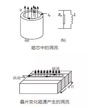 當變壓器工作時。磁芯中有磁力線穿過,在與磁力線垂直的平面上就會發生感應電流,因為電流自成閉合回路形成環流,且成旋渦狀,故稱為渦流。渦流的存在使磁芯發熱,消耗能量,這種損耗稱為渦流損耗。