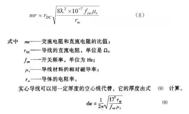 電阻損耗是變壓器或電感內部繞組的電阻發生的損耗。有兩種方式的電阻損耗:直流電阻損耗和集膚效應電阻損耗。直流電阻損耗由繞組導線的電阻與流過的電流有效值二次方的乘積所決定。集膚效應是由于在導線內強交流電磁場效果下,導線中心的電流被“推向”導線外表而使導線的電阻實際添加所致,電流在更小的截面中活動使導線的有效直徑顯得小了。式(8)給出了這兩個損耗在一個表達式中的計算式。