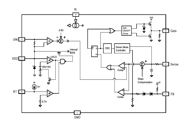 4.RI:參閱設置端。經過連接一個電阻接地來為SG6841供給一個穩定的電流,改動電阻阻值將改動PWM的頻率。