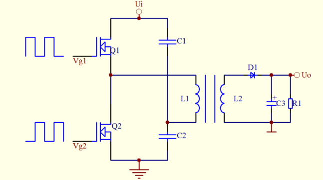 推挽式:電路選用推拉結構,每個開關管只作業半個周期,管子替換作業,所以輸出功率較大,一起Q1和 Q2是共地的,驅動控制電路也很簡單,能夠選用經典的SG3525驅動。值得注意的是Q1和Q2一起導通時,也就意味著Ll和L3短路。實際中一般設置死區以避免兩個管子一起導通。