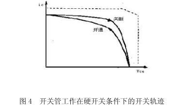 (d)二極管反向恢復問題:二極管由導通變為截止時存在著反向恢復期,在此期間內,二極管仍處于導通狀態,若立即開通與其串聯的開關器件,容易造成直流電源瞬間短路,產生很大的沖擊電流,輕則引起該開關器件和二極管耗急劇增加,重則致其損壞。圖4給出了接感性負載時,開關電源工作在硬開關條件下的開關的開關軌跡,圖中虛線為雙極性晶體管的安全工作區(Safetyoperation area,SOA),如果不改善開關管的開關條件,其開關軌跡很可能會超出安全工作區,導致開關管的損壞。
