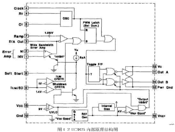 該芯片內部電路如圖4-2所示。它由振蕩器、PWM 比較器、限流比較器、過流比較器、基準電壓源、故障鎖存器、軟啟動電路、欠壓鎖定、PWM鎖存器、輸出驅動器等組成。我們將詳細介紹各部分的情況,以理解開關電源芯片的工作原理。
