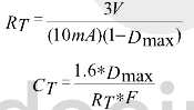 振蕩電路如圖4-3所示。UC3823A、B和UC3825A、B內部都有一個鋸齒波振蕩器。鋸齒波上升沿的斜率由RT 、Cr決定,確定RT、CT的方法是:首先根據要求的最大占空比Dmax、選擇RT,再根據要求的頻率以及RT和 Dmax選擇CT 計算公式為: