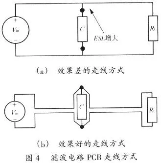 圖4顯示了在一個PCB上輸入電源(Vin)至負載(RL)的不同走線方式。為了降低濾波電容器(C)的ESL,其引線長度應盡量減短;而Vin。正極至RL和Vin負極至R1的走線應盡量靠近。