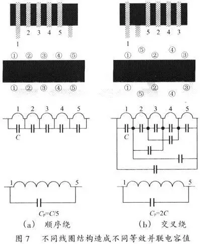 在開關電源中電感的Cp應該控制得越小越好。同時必須注意到,同一電感量的電感會由于線圈結構不同而產生不同的Cp值。圖7就顯示了同一電感量的電感在二種不同的線圈結構下不同的Cp值。圖7(a)電感的5匝繞組是按順序繞制。這種線圈結構的Cp值是l匝線圈等效并聯電容值(C)的1/5。圖7(b)電感的5匝繞組是按交叉順序繞制。其中繞組4和5放置在繞組1、2、3之間,而繞組l和5非??拷?。這種線圈結構所產牛的Cp是1匝線圈C值的兩倍。