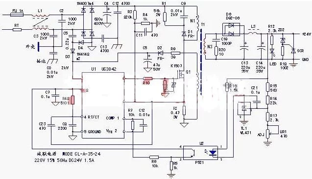 U1芯片和1、2腳外圍元件R7、C12,也是穩壓回路的一部分。實際上,TL1、U1組成了(相對于U1內部電壓誤差放大器)外部誤差放大器,將輸出24V的電壓改變反應回U1的反應電壓信號輸入端。