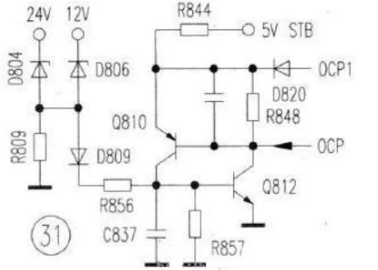 2、穩壓回路:開關變壓器的N3繞組、D6、C13、C14等元件組成的24V電源,基準電壓源TL1、光耦合器U2等元件構成了穩壓操控回路。