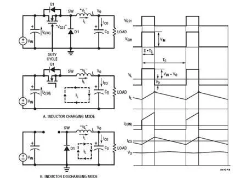 當濾波器電感L和輸出電容CO的值足夠高時,輸出電壓VO為只要1mV紋波的直流電壓。在這種情況下,關于12V輸入降壓電源,從概念上講,27.5%的占空比供給3.3V輸出電壓。