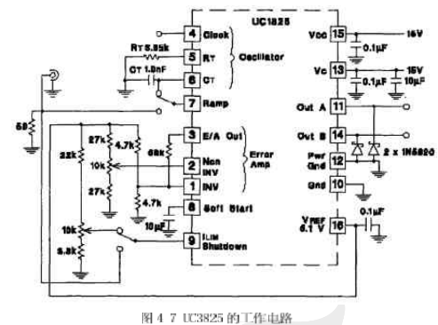UC3825是控制電路的核心,通過前面的介紹,我們知道,這種PWM集成控制器集成了很多的功能,以前需要用分立單元完成的功能,現在都可以通過UC3825來完成,它的-般用法如圖5-7所示。