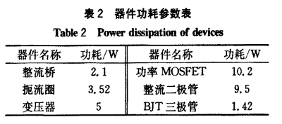 根據(jù)主要發(fā)熱元器件的損耗計(jì)算公式,得到各損耗值,將其導(dǎo)入仿真軟件;利用Ansoft仿真軟件的內(nèi)部求解器獲得實(shí)際電路的3D發(fā)熱模型,如圖2所示。從圖中可以清晰地看到電路內(nèi)部及各個(gè)元器件上的熱量分布情況。根據(jù)仿真結(jié)果(圖2)可知,功率MOSFET上的熱量和變壓器的熱量最高(紅色部分),這與從電路理論上分析求得的這兩種器件的功耗(見表2)相吻合。
