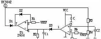 當輸出電路短路,輸出電壓消失,光耦OT1不導通,UC3842①腳電壓上升至5V左右,R1R2的分壓超越TL431基準,使之導通,UC3842⑦VCC電位被拉低,IC停止作業。UC3842停止作業后腳電位消失,TL431不導通UC3842⑦腳電位上升,UC3842重新啟動,循環往復。當短路現象消失后,電路能夠主動康復成正常作業狀況。