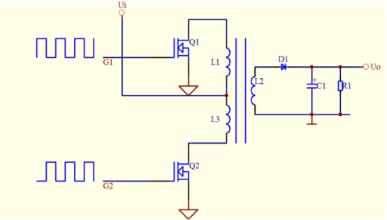該種開關電源成本較低,能夠輸出多組不同的電壓,電壓調整方便,因而運用非常廣泛。首要缺點是:紋波電壓較大(一個周期僅作業半個周期左右)。另一點便是,當Q截止時,Q1接受很大的反向電壓。U=2Ui,所以Q1選擇耐壓較大的。