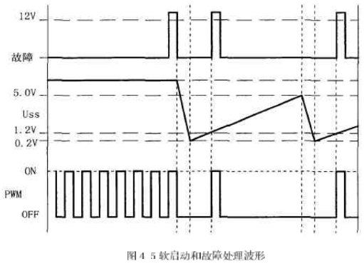 軟發動和故障處理波形如圖4-5所示。軟發動是經過軟發動(SOFT,START)腳的外接電容完結的。接通電源后,軟發動腳外接電容放電,該腳處于低電平,差錯擴大器輸出低電平,開關電源無輸出電壓。當9uA的內部電流源給軟發動腳外接電容充電時,差錯放人器輸出電壓逐步升高,直到閉環調理功用開端T.作,開關電源輸出電壓逐步升高到額外值。一旦限流(ILIM)腳的電平超越1.2V故障鎖存器置位,輸出腳變為低電平;一起,軟發動腳外接電容以250uA的電流放電。在軟發動電容放完電后,限流腳電平降到1.2V以下時,故障鎖存器就不輸出脈沖。這時,故障鎖存器復位,芯片開端軟發動進程。