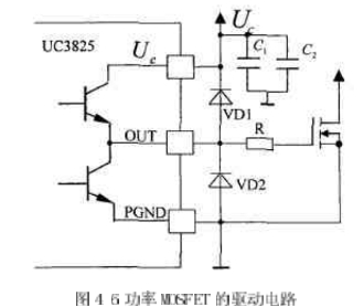 功率MOSFET驅動電路如圖4-6所示。UC3825推拉式輸出電路的每個輸出端都可輸出峰值為2A的電流。該輸出電流在20ns內可使1000pF電容兩端的電壓上升15V。選用獨立的集電極電源Uc和功率地線PGND腳,能夠減小大功率門極驅動噪聲對集成電路內模仿電路的攪擾。每個輸出端(OUT)UcPGND之間,都應參加一只3A的肖特基二極管(IN5120USID245或相同功用的器材),如圖4-6所示。該二極管可將輸出電壓的幅值鉗位在電源電壓,這對任何電感性和電容性負載都是必要的。