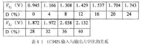 經過試驗可知,UC38252腳輸入和outA.outB輸出的PWM脈沖信號的占空比是滿意線性聯系的。具休試驗數據如表4-1所示。咱們界說UC38252腳輸入為v2,輸出的PM信號占空比為D。從表41中的數據能夠看出,端口2的數值范鬧為:0.945V~-2.132v,而PWM脈沖信號的占空比在0%~-40%之間改變,與上述的結論是吻合的。