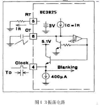 振動電路如圖4-3所示。UC3823ABUC3825AB內部都有一個鋸齒波振動器。鋸齒波上升沿的斜率由RTCr決議,確認RTCT的辦法是:首要依據要求的最大占空比Dmax、挑選RT,再依據要求的頻率以及RTDmax挑選CT計算公式為: