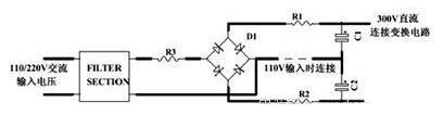 上圖所示為串聯電阻法沖擊電流控制電路(適用于橋式整流和倍壓電路,其沖擊電流相同),關于110V、220V雙電壓輸入電路,應該在R1和R2方位放兩個電阻,這樣在110V輸入銜接線銜接時和220V輸入銜接線斷開時的沖擊電流相同大。關于單輸入電壓電路,應該在R3方位放電阻。