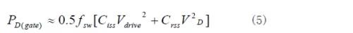 功率MOSFET驅動功率比雙極型功率晶體管高。MOSFET柵極有兩個與漏源極相連的等效電容,即柵源電容Ciss和漏源電容Crss。MOSFET柵極驅動的損耗來自于注冊MOSFET時輔佐電壓對柵極電容的充電,關斷MOSFET時又對地放電。柵極驅動損耗核算由式(5)給出。