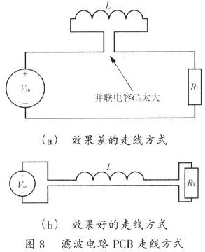 圖8閃現了在一個PCB上Vin通過L至負載(RL)的不同走線辦法。為了下降電感的Cp,電感的二個引腳應盡量遠離。而Vin正極至RL和Vin負極至RL的走線應盡量靠近。