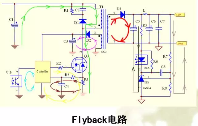 ●Y電容的連接點(diǎn),講究一個(gè)“靜”,很顯然上圖Y電容最佳連接點(diǎn)事C1的負(fù)端,以及變壓器T1的次級(jí)7腳。