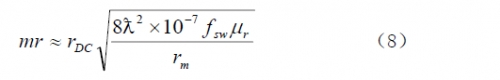 電阻損耗是變壓器或電感內(nèi)部繞組的電阻產(chǎn)生的損耗。有兩種方式的電阻損耗:直流電阻損耗和集膚效應(yīng)電阻損耗。直流電阻損耗由繞組導(dǎo)線的電阻與流過的電流有效值二次方的乘積所決議。集膚效應(yīng)是因為在導(dǎo)線內(nèi)強(qiáng)溝通電磁場效果下,導(dǎo)線中心的電流被“推向”導(dǎo)線表面而使導(dǎo)線的電阻實踐添加所造成的,電流在更小的截面中活動使導(dǎo)線的有效直徑顯得小了。式(8)給出了這兩個損耗在一個表達(dá)式中的計算式。